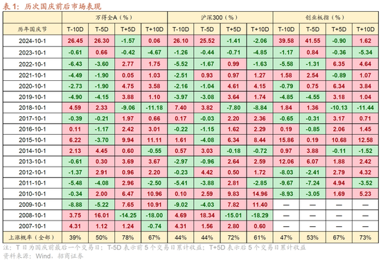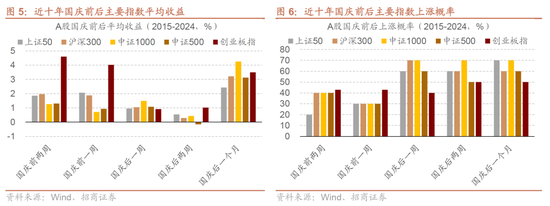 A股国庆节前后市场表现同样呈现出一定的日历效应。具体来说,国庆节前市场交投相对清淡,部分资金在避险需求下流出,导致市场表现不佳。然而,国庆节后市场风险偏好改善,主要指数往往迎来反弹。从过去十年A股国庆节后一周表现来看,上证指数、沪深300、中证1000指数上涨概率均超60%。从2007年以来的数据统计看,万得全A在国庆节后5个交易日区间上涨概率达78%。