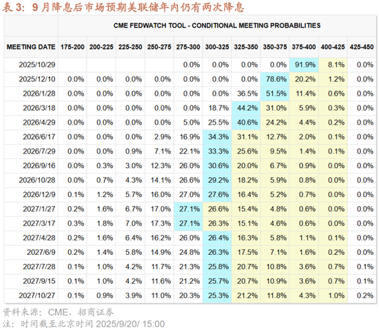 9月美联储议息会议整体符合市场预期,呈现鸽派决策+鹰派表述的预期管理。会议如期降息25bp,且给出的降息指引显示年内仍有50bp的降息空间。同时,鲍威尔表示,9月的降息举措是一项风险管理决策,没有必要快速调整利率,今天对于降息50个基点并没有广泛的支持。9月的点阵图显示,大多数委员支持2025年内仍有50bp的降息空间;过半数委员支持2026年至少还有25bp降息空间,目前市场普遍预期美联储年内仍有两次降息。