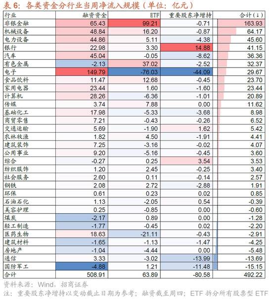 从全周资金流动的情况来看,本周融资资金净流入,新成立偏股类公募基金上升,ETF净申购。具体来看,融资资金前四个交易日合计净流入507.9亿元;新成立偏股类公募基金221.1亿份,较前期上升58.7亿份;ETF净申购,对应净流入62.4亿元。