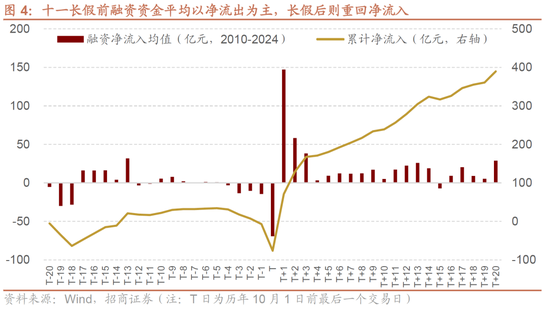 国庆长假前后,融资盘通常呈现出“节前收敛、节后迸发”的变化规律。节前融资盘多趋向谨慎,作为高风险偏好资金,在国庆长假前,融资客会倾向于卖出股票偿还融资,减少持仓,以规避长假期间可能出现的不可预测的风险和利息成本。从2010-2024年历史平均表现看,融资在节前5个交易日均以卖出为主,节前最后一个交易日平均流出规模最高为69亿元。国庆节后,如果假期期间没有重大利空,或者甚至有利好政策释放,市场风险偏好会快速回升,融资客会成为重要的增量资金之一,大举入市,2010-2024年融资资金在国庆后首个交易日平均净流入147亿元,且随后的20个交易日大部分时间均保持净流入趋势。