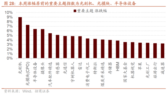本周A股市场跌多涨少,万得全A下跌0.18%,沪深300下跌0.44%,创业板指上涨2.34%。A股涨幅居前的重要主题指数为光刻机、光模块、半导体设备。