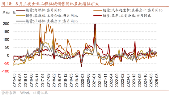 8月主要企业工程机械销售当月同比多数改善。主要企业装载机销量同比增幅扩大5.89个百分点至13.30%,三个月滚动同比增幅扩大2.02个百分点至10.67%;主要企业叉车销量同比增幅扩大5个百分点至19.40%,三个月滚动同比增幅扩大2.53个百分点至18.97%;主要企业压路机销量同比增幅收窄9.70个百分点至14.10%,三个月滚动同比增幅收窄0.97个百分点至16.37%;主要企业汽车起重机销量同比由正转负至-4.65%(前值为9.60%),三个月滚动同比跌幅收窄1.15个百分点至-0.11%;主要企业内燃机销量同比增幅扩大3.35个百分点至17.63%,三个月滚动同比增幅扩大1.77个百分点至12.72%。