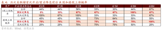 根据历史经验,在历次美联储首次开启/重启预防式降息后,A股和港股在未来上涨概率更高。显示中国资产受益于预防式降息下宽松的美元流动性环境。具体来看,港股在未来1周、2周上涨概率达到75%。在预防式降息后的3个月A股和港股上涨概率分别达到100%和75%;降息后的半年,港股上涨概率达到100%。中期维度上,整体继续看好美联储重启降息环境下,A股和港股的投资机会。