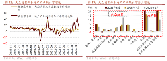 大众消费品、地产产业链加权平均增幅均收窄,家电、家具在政策提振下维持双位数增长,金银珠宝、文化办公用品表现亮眼。大众消费品产业链当月加权平均增幅收窄至4.8%(前值5.3%),细分领域必选消费表现分化,小额可选消费普遍改善,必选消费中限额以上粮油食品单月同比增幅收窄至5.8%,烟酒同比转负至-2.3%,高温天气影响叠加服装换季需求,饮料、服装鞋帽针纺织品同比增幅分别扩大至2.8%和3.1%。可选消费中化妆品、金银珠宝、中西药品类同比增幅分别扩大至5.1%、16.8%和0.9%,日用品类增幅收窄至7.7%。地产产业链当月加权平均增幅收窄至13.2%(前值24.6%),其中“以旧换新”等政策效应递减,家用电器音像器材增幅收窄至14.3%(前值28.7%),家具同比增幅收窄至18.6%(前值20.6%),地产销售仍然处于历史较低水平,拖累建筑及装潢材料社零同比降幅扩大至-0.7%(前值-0.5%);其他领域文化办公用品同比增幅扩大至14.2%(前值13.8%)、通讯器材同比增幅收窄至7.3%(前值14.9%)、汽车同比转正至0.8%(前值-1.5%)。