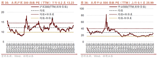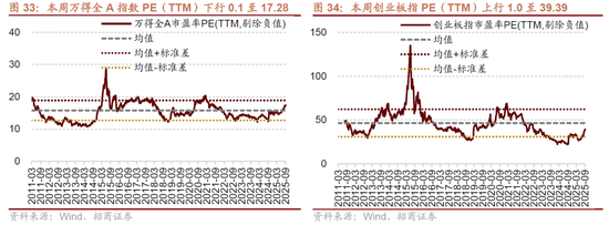 本周整体A股估值水平下行。截至9月19日收盘,万得全A指数PE(TTM)为17.28,处于历史估值水平(10年以来)的67.7%分位数。创业板指PE(TTM)上行1.0至39.39,处于历史估值水平的37.9%分位数。代表大盘股的沪深300指数PE(TTM)下行0.2至13.23,处于74.4%分位数。代表中小盘股的中证500指数PE(TTM)上行0.1至25.99,处于历史估值水平的48.6%分位数。