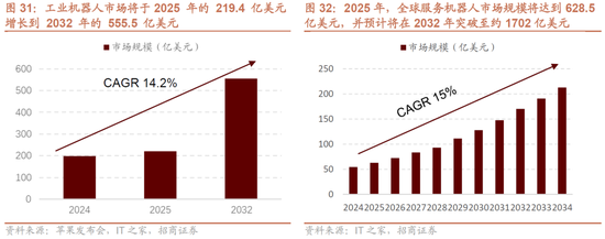 随着智能制造和人形机器人应用的拓展,服务机器人特别是人形机器人市场的增速将快于工业机器人,显示出新兴赛道的成长性。根据先前PR与FB所发布的最新数据显示,服务机器人市场相比工业机器人预计在未来几年内增长率要高,至2032-2034 年,其增长可能更快、占比将越发显著。此外,由于服务机器人覆盖业务范围更广(包含了医疗、物流、家庭、商业服务等),所以其应用场景与未来潜力被普遍看好,因此未来服务机器人产业有望进一步发展演进。